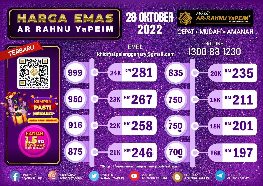 Harga Emas 27 Oktober 2022 CepatMudahAmanah ArRahnuYaPEIM ProdukArRahnuYaPEIM. Harga emas semasa pada Thursday 03-11-2022 jam 12. Harga Emas Ar Rahnu YaPEIM yang.